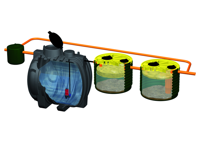 Systèmes d'accumulation de premières pluies composés d'un puits de drainage, d'un réservoir d'accumulation avec pompe temporisée, dessableur et séparateur d'huile en polyéthylène pour le traitement des eaux usées d'activité.