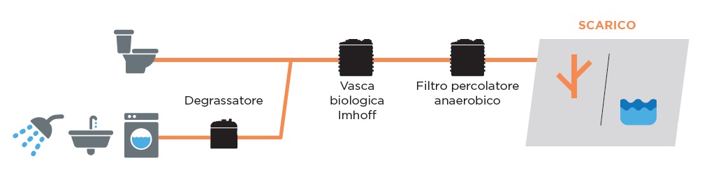Stațiile de epurare a apelor uzate cu evacuare sub irigație sunt de tip subteran și sunt compuse dintr-un sifon pentru epurarea apelor uzate provenite din bucătării, un rezervor imhoff pentru eliminarea solidelor în suspensie provenite din băi și un filtru anaerob de percolare pentru a respecta deversarea de subirigare. Stațiile de epurare cu deversare sub irigație permit respectarea tabelului pentru deversarea sub irigație. Toate containerele din partea superioară au trape care permit operațiunile de purjare și inspecție. Aceste tratamente de purificare sunt folosite în activități